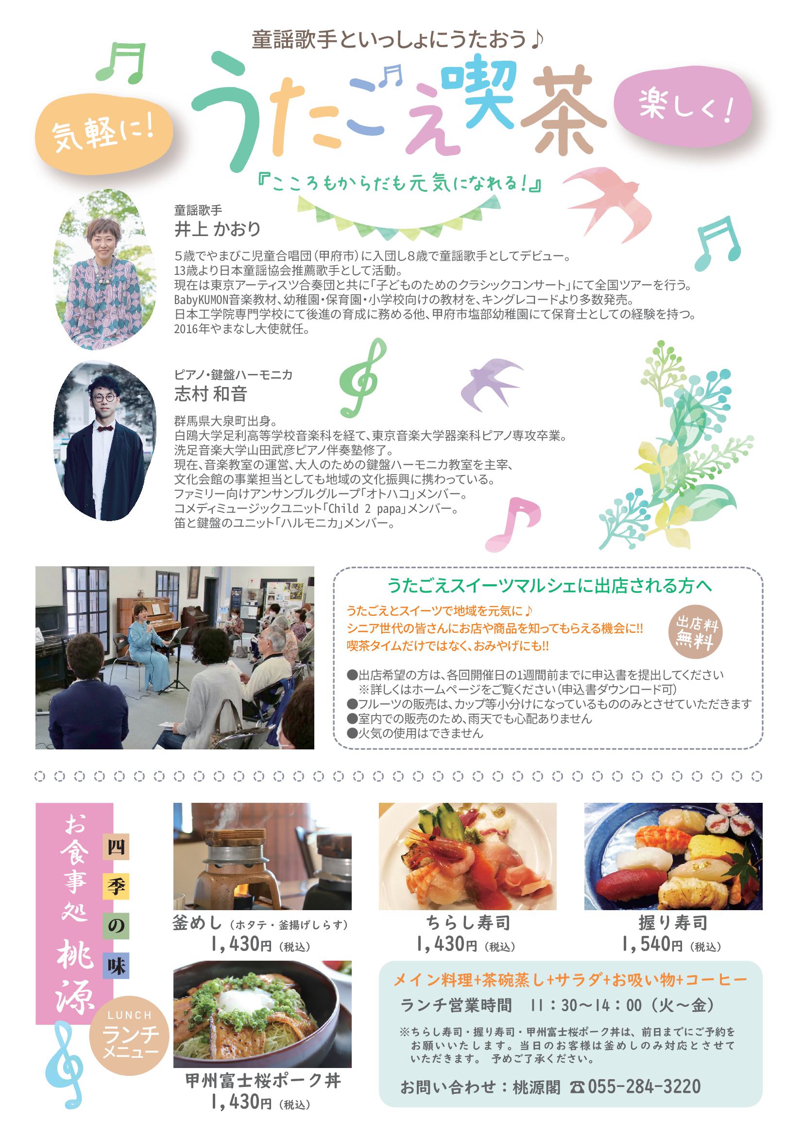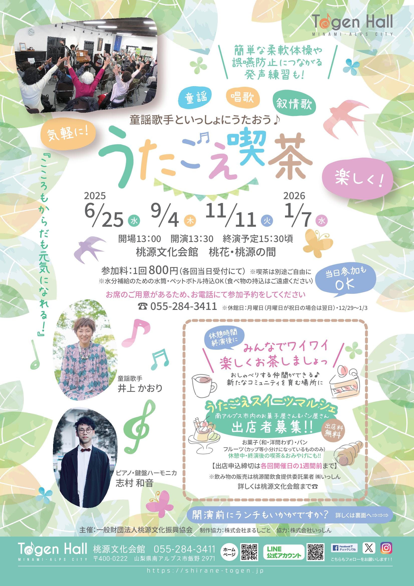 | 童謡歌手といっしょにうたおう♪ うたごえ喫茶 童謡や昔懐かしい唱歌や叙情歌をみんなで歌って、こころもからだも元気に‼ ●日時 2026年1月7日(水) 開場13:00/開演13:30/終演予定15:30頃 ●場所 桃源文化会館 桃花・桃源の間 ●参加料 1回800円(各回当日受付にて)※喫茶は別途ご自由に 【お席のご用意があるため、お電話にて参加予約をしてください】 電話:055-284-3411 ※休館日:月曜日(月曜日が祝日の場合は翌日)・12/29~1/3 ※水分補給のための水筒・ペットボトル持込OK(食べ物の持込はご遠慮ください) ●講師 ★歌:井上 かおり(童謡歌手) 5歳でやまびこ児童合唱団(甲府市)に入団し8歳で童謡歌手としてデビュー。 13歳より日本童謡協会推薦歌手として活動。現在は東京アーティスツ合奏団と共に「子どものためのクラシックコンサート」にて全国ツアーを行う。BabyKUMON音楽教材、幼稚園・保育園・小学校向けの教材を、キングレコードより多数発売。日本工学院専門学校にて後進の育成に務める他、甲府市塩部幼稚園にて保育士としての経験を持つ。2016年やまなし大使就任。 ★ピアノ・鍵盤ハーモニカ:志村 和音 群馬県大泉町出身。白鴎大学足利高等学校音楽科を経て、東京音楽大学器楽科ピアノ専攻卒業。 洗足音楽大学山田武彦ピアノ伴奏塾修了。現在、音楽教室の運営、大人のための鍵盤ハーモニカ教室を主宰、文化会館の事業担当としても地域の文化振興に携わっている。ファミリー向けアンサンブルグループ「オトハコ」メンバー。コメディミュージックユニット「Child 2 papa」メンバー。笛と鍵盤のユニット「ハルモニカ」メンバー。 ◆◆◆うたごえスイーツマルシェ◆◆◆ うたごえとスイーツで地域を元気に♪ おしゃべりする仲間ができる 新たなコミュニティを育む場所に 南アルプス市内のお菓子屋さん&パン屋さん 出店者募集‼ ★出店料無料 お菓子(和・洋問わず)・パン フルーツ(カップ等小分けになっているもののみ) シニア世代の皆さんにお店や商品を知ってもらえる機会に‼ 休憩中・終演後の喫茶&おみやげにも‼ 【出店申込締切は各回開催日の1週間前まで】 申込多数の際は、調整させていただく場合がございます。 出店申込書はこちら ※飲み物の販売は桃源閣飲食提供委託業者 ㈱いっしん 詳しくは桃源文化会館まで 電話:055-284-3411 ※休館日:月曜日(月曜日が祝日の場合は翌日)・12/29~1/3 ●主催 一般財団法人桃源文化振興協会 |